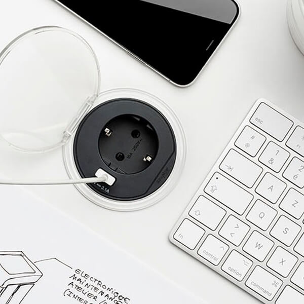 Uttagsenhet med jordat uttag och USB A. Den är perfekt för installationer där det behövs extra räckvidd, vid köksön eller kontor i öppna landskap då du får med en 2 meters kabel.